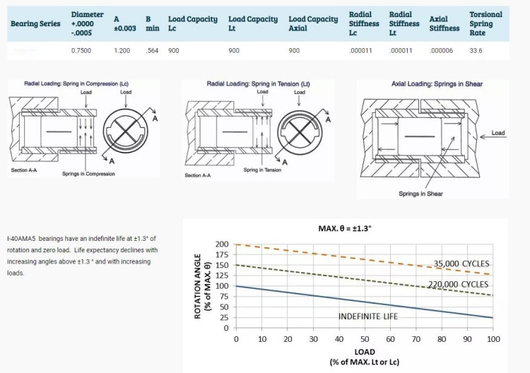 特殊要求:物質的 :因科內爾718高磷鎳黃銅Tsr :高扭轉彈簧速率I-40-MA5標準材料屬性部件材料: 因科內爾718黃銅合金: 高磷鎳板春季材料特性:疲勞強度: 77,000 psi產量強度: 160,000 psi極限抗拉強度: 196,000 psi彈性模塊: 29,000,000 psi注:軸承的堅硬度按每磅載荷的偏轉英寸來定.這一數據適用于標準懸臂軸承在無支架的一半的中間點上,在0度旋轉。扭轉彈簧速率:(在*Lb/度)標準C-自由軸承的速率一般在零載荷時在這些數值的+/-10%之內。負載能力:lt或lc(在張力或壓縮中的重磅負載),這些值為零偏轉時的**負載(重量或靜態力)。在給軸承上漿時,必須考慮載荷要求、角偏轉和循環壽命。LC是純粹的徑向載荷,在彈簧中產生壓縮應力,而LT是純粹的徑向載荷,產生拉伸應力。軸承系列 直徑計+.0000-.0005 A±0.003 B**多的 負荷能力地方法院 負荷能力中尉 負荷能力軸的 放射性的僵硬地方法院 放射性的僵硬中尉 軸的僵硬扭轉的彈簧